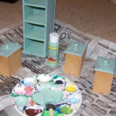 1. To begin the transformation I painted everything with a light coat of Apple Barrel acrylic paint in Victorian Green (love that color). After it dried I painted a light coat of crackle medium over the green areas. I used a light coat for smaller cracks...the heavier the coat the larger the cracks.